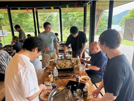 観光は、24名が参加し、関所跡の見学、芦ノ湖での遊覧船、芦ノ湖キャンプ村でのBBQ、そして三島スカイウォークの散策をしました。関所跡では、史跡の見学だけではなく、時代劇コメディの実演もあって楽しめる施設でした。芦ノ湖遊覧船は当日の強風により一時欠航になっていましたが、乗船予定時刻に運航再開して何とか乗船できたもののデッキはかなりの強風でした。BBQは高気温により室内開催になってしまいましたが、どこで食べようとも美味しければ大満足です。三島スカイウォークは、長さ400 m、高さ70.6 m、主塔高さ44 m、歩道幅1.6 mの人道吊り橋です。吊り橋の上もやはり強風で恐怖しました。